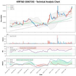 - 추세: 최근 6개월 수익률이 +77.36%, 최근 1개월 수익률만 +44.24%입니다. 모든 이동평균선(5, 20, 60, 120일)이 정배열 상태로, 강력한 상승 추세를 증명합니다.