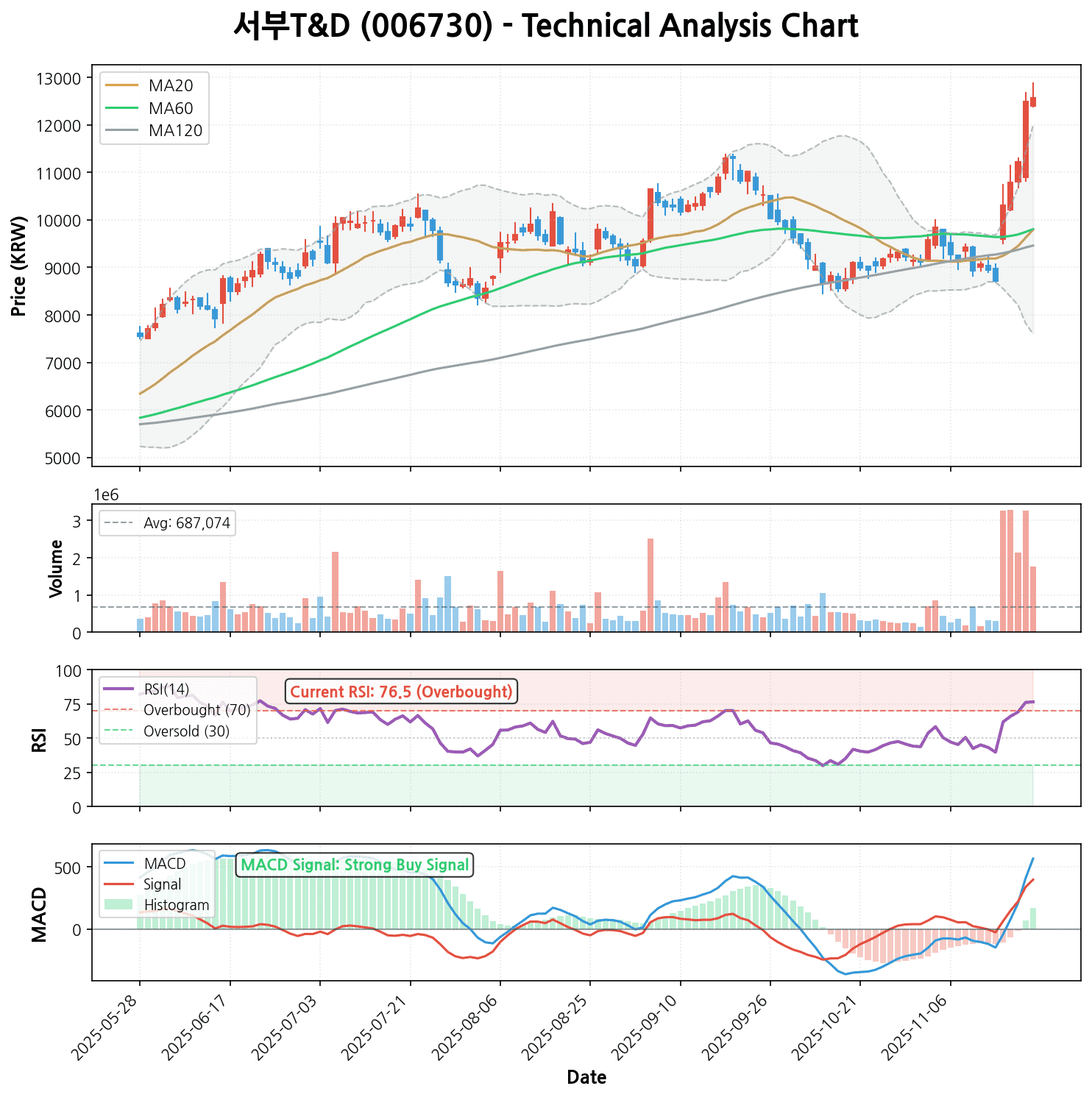 RSI가 70을 넘어서면 일반적으로 ‘과매수’ 구간으로 해석합니다. 이는 단기적으로 주가가 과열되어 있어, 차익실현 매물 출회나 기간 조정의 가능성이 있다는 신호입니다. 신규 진입을 고려한다면 추격 매수보다는 조정 시 분할 매수하는 전략이 유효할 수 있습니다. -