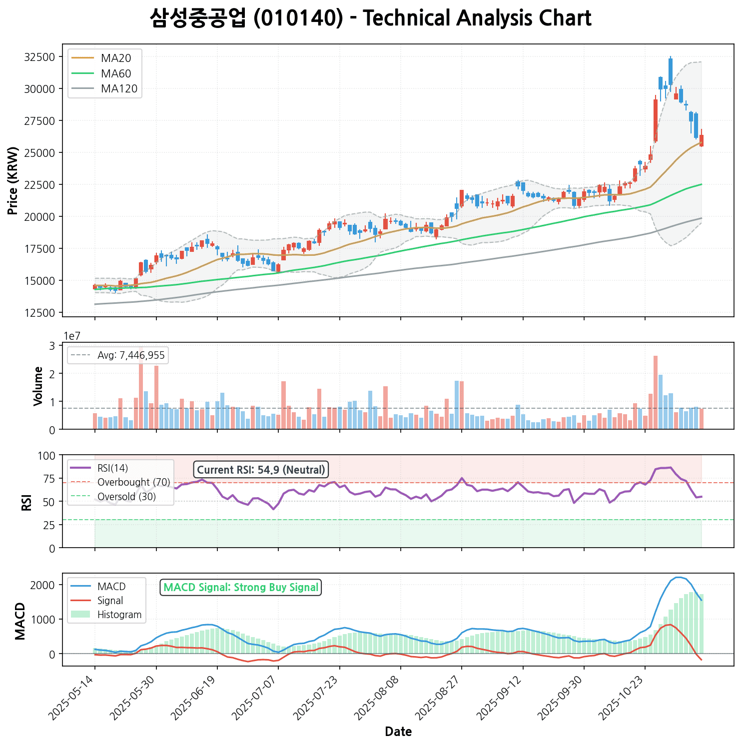 삼성중공업은 강력한 수주 모멘텀과 재무 건전성, 그리고 명확한 턴어라운드 스토리를 보유한 매력적인 종목입니다. 단기적으로 주가가 급등하여 밸류에이션 부담이 존재하지만, 조선업 슈퍼사이클이라는 거대한 파도에 올라탄 이상 중장기적인 상승 추세는 유효할 것으로 판단됩니다.