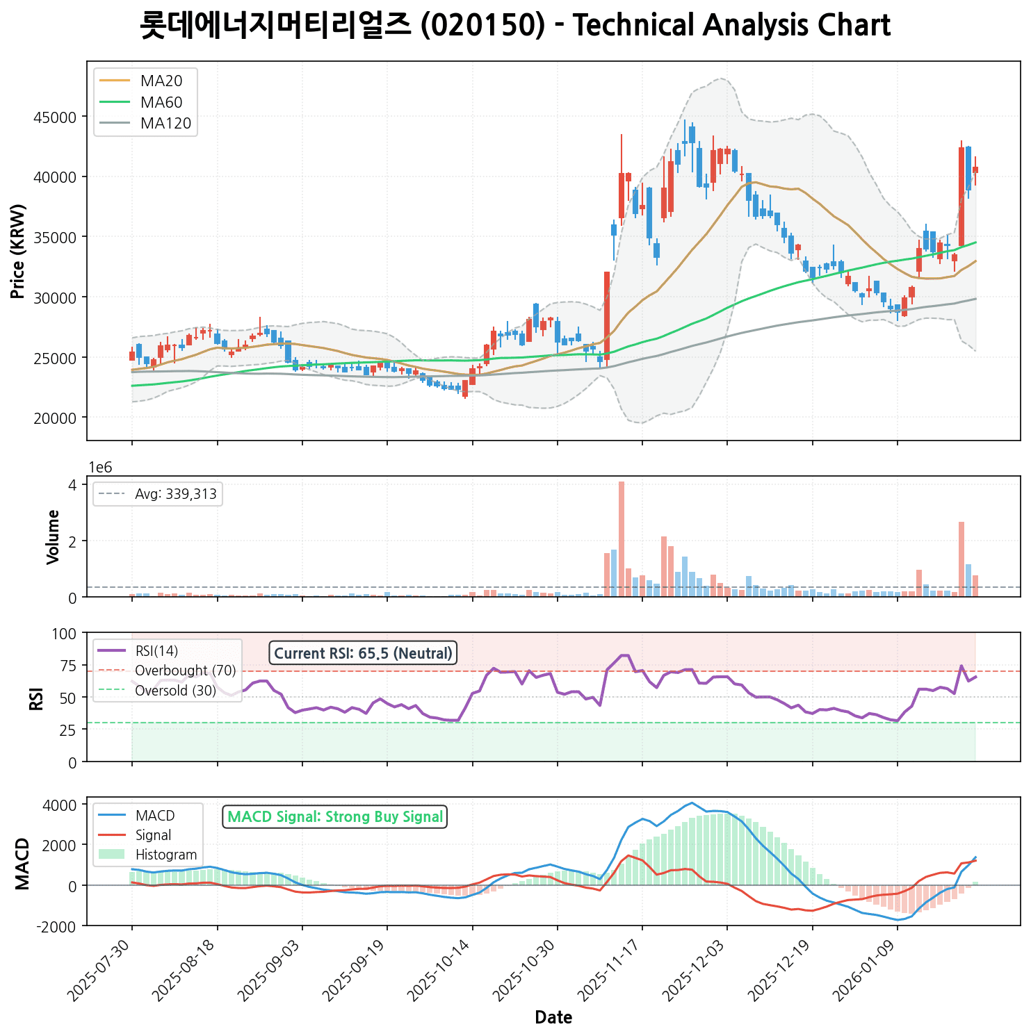 * 추세: 완벽한 정배열 상승 추세입니다. 5일 > 20일 > 60일 > 120일 이동평균선이 부채꼴처럼 펼쳐지며 상승 에너지를 분출하고 있습니다.