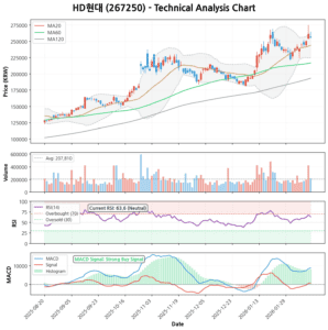 - MACD: 시그널 위에서 히스토그램이 양수(+)를 유지하며 ‘강력 매수’ 신호를 보내고 있습니다. 상승 에너지가 아직 살아있다는 뜻입니다.