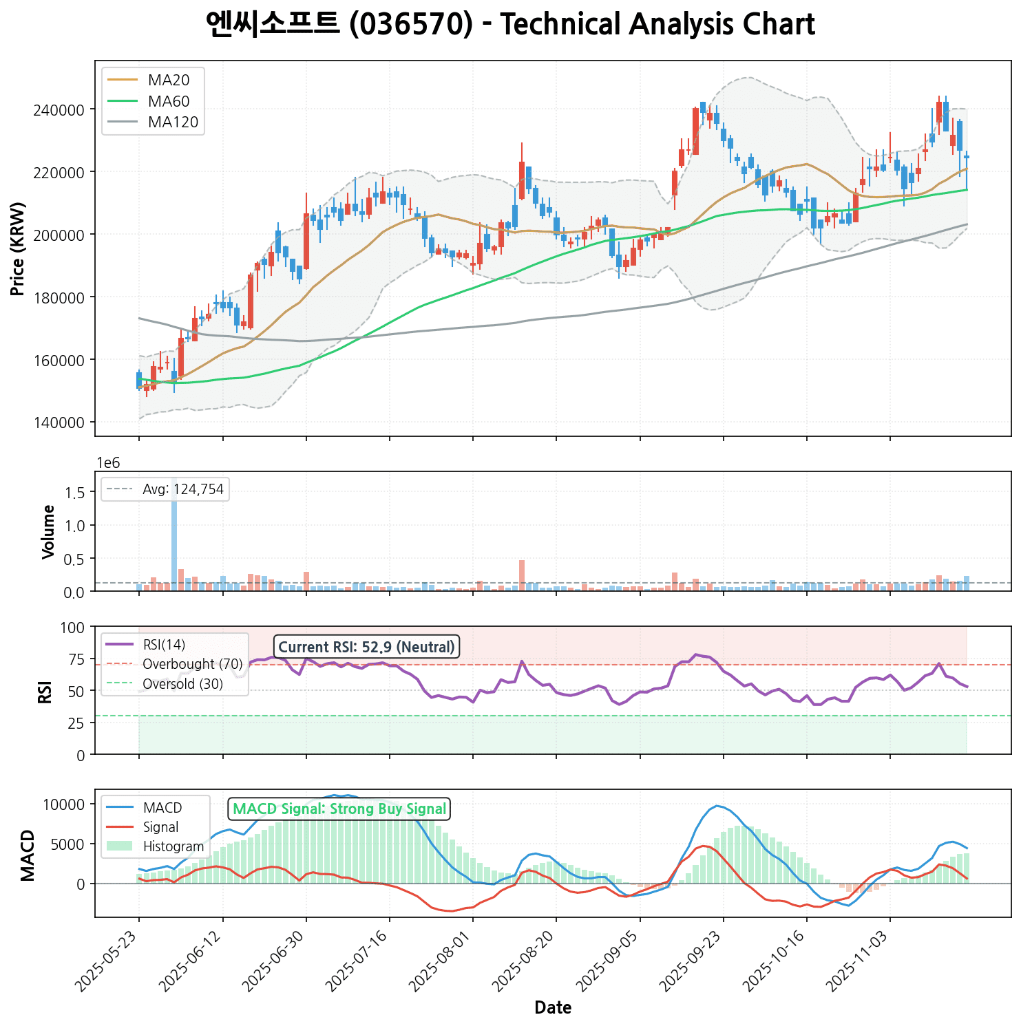 최근 120거래일 동안 엔씨소프트의 주가는 바닥을 다지고 강력한 상승 추세를 보여주고 있습니다. 최저가 15만원 대비 현재 22만원대까지 50% 가까이 상승하며 완벽한 V자 반등의 초기 국면을 그리고 있습니다.