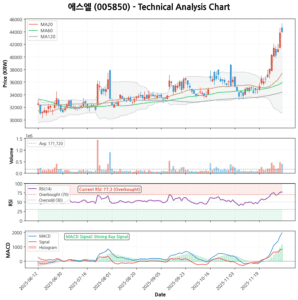 모멘텀 지표를 살펴보면, RSI(14일)는 54.21로 과매수 구간이 아닌 중립적인 수준에 있어 추가적인 상승 여력이 충분하다고 판단됩니다. MACD 지표는 MACD(1793.51)가 MACD 시그널(-173.02)을 크게 상회하고 있으며, MACD 히스토그램(1966.52) 또한 매우 높은 양수 값을 기록하고 있어 strong_buy 신호를 명확히 보내고 있습니다. 이는 단기적으로 강력한 매수세가 유입되고 있으며, 주가 상승 추세가 견고함을 의미합니다.