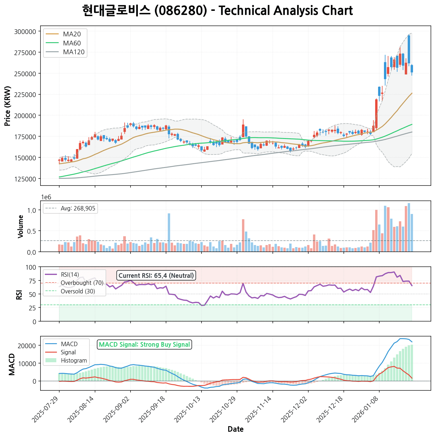 - 해석: 단기 급등에 따른 피로감으로 5일선(261,600원) 근처에서 공방이 있을 수 있으나, 20일선(226,245원)이 든든한 지지선 역할을 하며 우상향 기조를 이어갈 가능성이 큽니다.