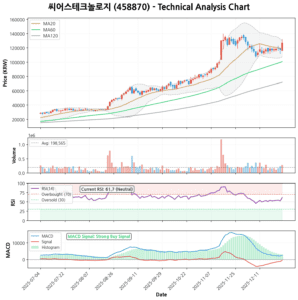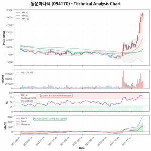 현재 주가(32,600원)는 모든 이동평균선(MA5: 29,410원, MA20: 29,012.5원, MA60: 23,192.5원, MA120: 20,578.33원) 위에 위치하며 강력한 정배열을 형성하고 있습니다. 이는 ‘strong_uptrend’ 신호를 명확히 보여줍니다. 모멘텀 지표인 RSI(14일)는 69.58로 과매수 구간에 근접했지만 아직 진입하지 않아 추가 상승 여력이 남아있을 수 있습니다. MACD 역시 MACD 시그널을 상회하며 ‘strong_buy’ 신호를 나타내고 있어 전반적인 기술적 추세는 매우 긍정적입니다. 이동평균선들이 강력한 지지선 역할을 할 것으로 예상되며, 특히 MA20(약 29,012원) 부근이 중요한 단기 지지선이 될 수 있습니다.
