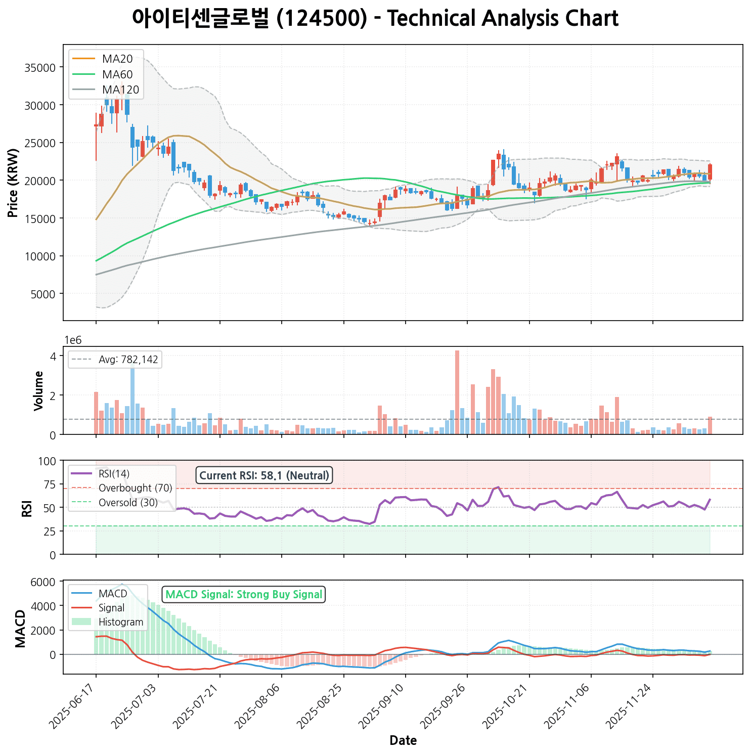 모멘텀 지표를 살펴보면, RSI(14일)는 58.14로 과매수/과매도 구간이 아닌 중립적인 수준에서 매수 우위를 보이고 있습니다. 특히 MACD는 267.65로 MACD 시그널(-15.88)을 상회하며 MACD 히스토그램이 283.53으로 강하게 양의 값을 나타내고 있습니다. 이는 MACD ‘strong_buy’ 신호와 ‘strong_uptrend’ 이동평균선 추세와 일치하며, 단기적으로 강력한 매수 모멘텀이 형성되고 있음을 시사합니다. 20,000원 선은 강력한 지지선으로 작용하며, 이 가격대 위에서 상승 추세를 이어갈 가능성이 높습니다.
