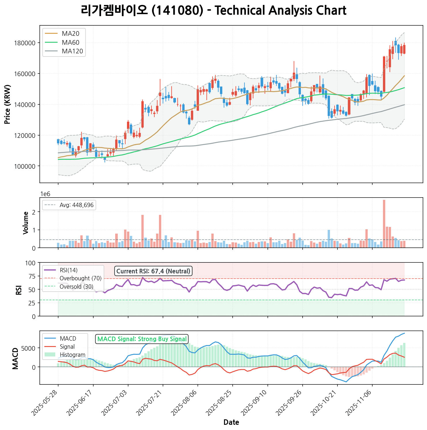 최근 120거래일 동안 리가켐바이오의 주가는 최저 10만 원에서 최고 18만 원까지 가파르게 상승하며 55.23%의 놀라운 수익률을 기록했습니다. 이는 매우 강력한 상승 추세가 형성되었음을 의미합니다.