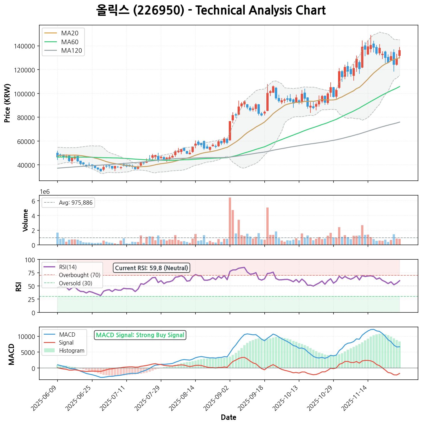– 모멘텀 지표: RSI는 59.84로 아직 과매수 구간(70 이상)에 진입하지 않아 추가 상승 여력이 남아있음을 시사합니다. MACD 역시 시그널 선을 큰 폭으로 상회하며 ‘강력 매수’ 신호를 보내고 있습니다.