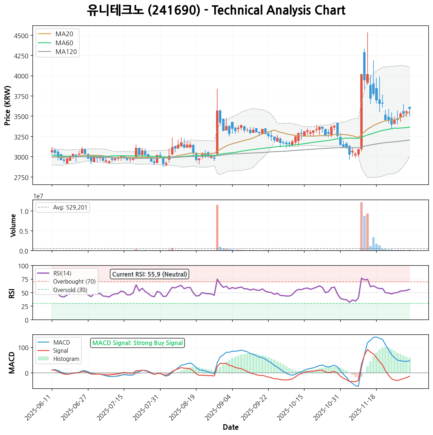현재 주가(3,595원)는 5일, 20일, 60일, 120일 이동평균선 위에 모두 안착해 있으며, 이동평균선들이 차례로 위를 향하는 완벽한 정배열 초기 국면을 형성하고 있습니다. 이는 매우 강력한 상승 추세 신호로 해석됩니다.