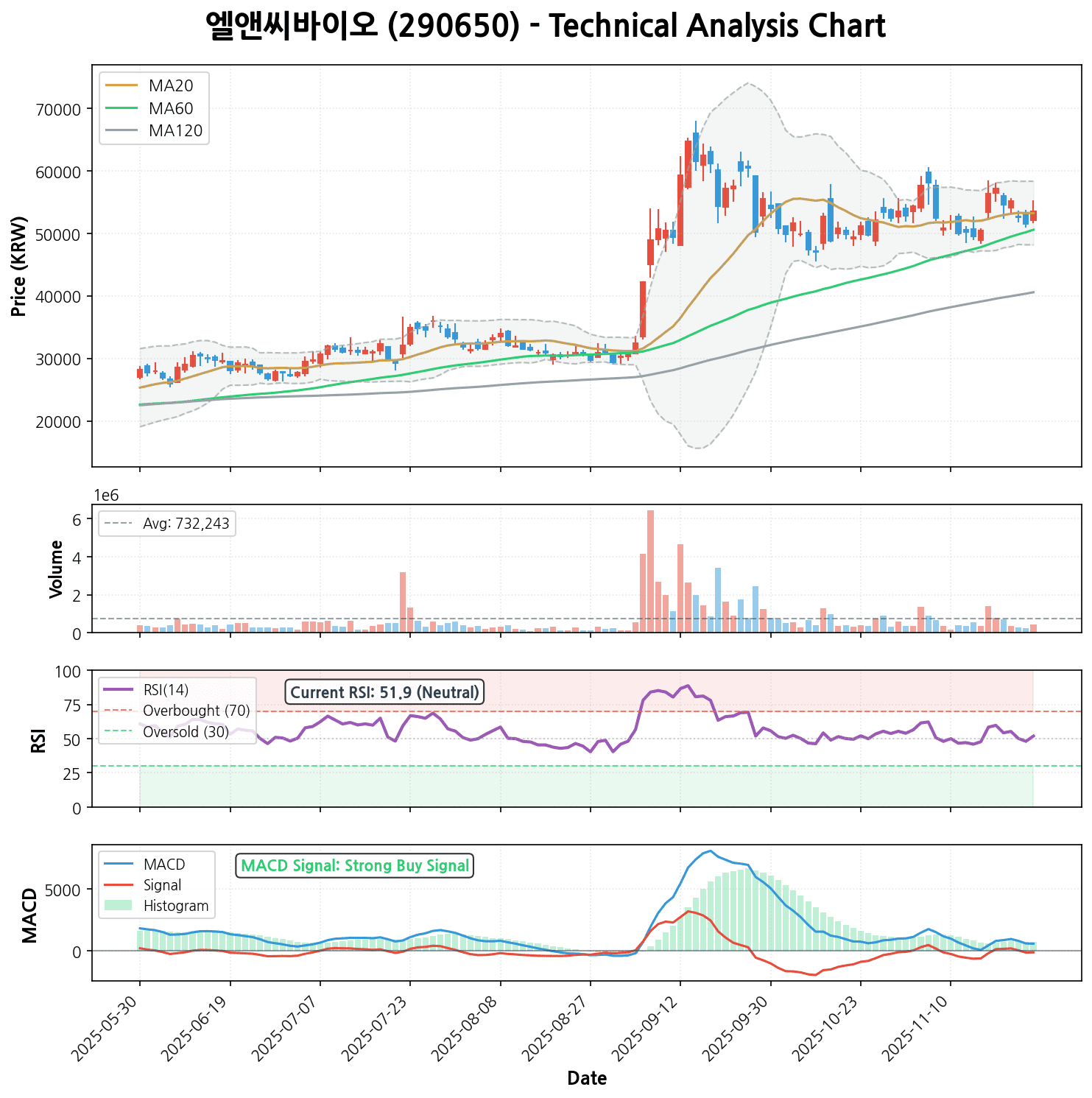 엘앤씨바이오의 주가는 최근 120거래일 동안 89.72%라는 경이로운 수익률을 기록하며 강력한 상승 추세를 형성했습니다. 최저 3만원에서 최고 7만원까지 급등한 후, 현재 5만원 부근에서 숨을 고르는 모습입니다.
