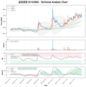 • RSI(14일): 61.44로, 과매수 구간 진입 직전의 강한 매수 모멘텀을 나타냅니다. 아직 과열 구간은 아니지만, 상승세가 지속되면 단기적으로 조정 가능성도 염두에 두어야 합니다.
