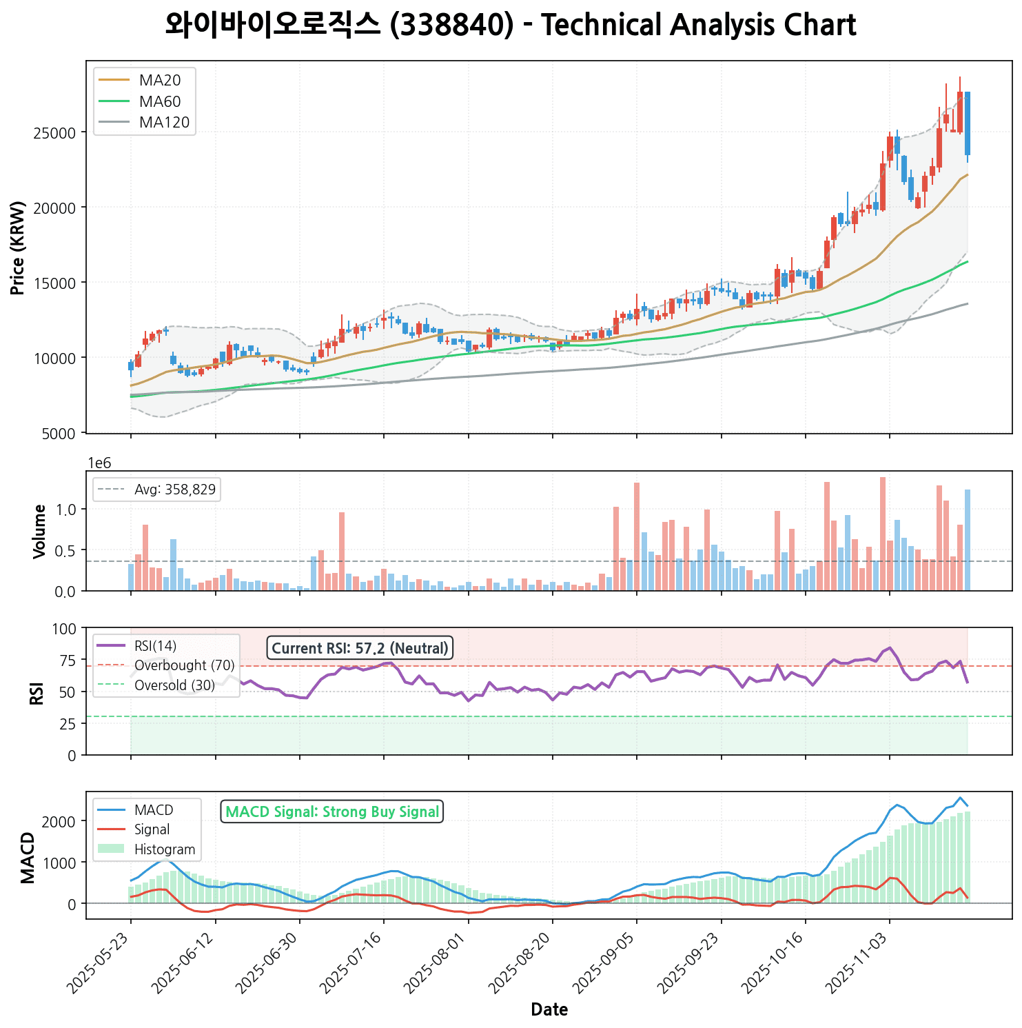 와이바이오로직스는 최근 120거래일 동안 155.99%라는 경이로운 수익률을 기록하며 강력한 상승 추세를 형성했습니다. 최저가 8,710원에서 최고가 30,000원까지 급등한 후 현재 20,000원 선에서 조정을 거치고 있습니다.