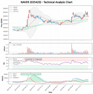 최근 120거래일 동안 54.36%라는 높은 수익률을 기록하며 강력한 상승 추세를 형성하고 있습니다. 현재 주가는 최고가(3,230원) 대비 조정을 받은 상태지만, 여전히 모든 이동평균선이 정배열을 이루는 ‘strong_uptrend’ 구간에 있습니다.